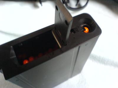 Das Magazin ist ein Highcap mit einem Fassungsvermögen von ca. 300 BB. Die