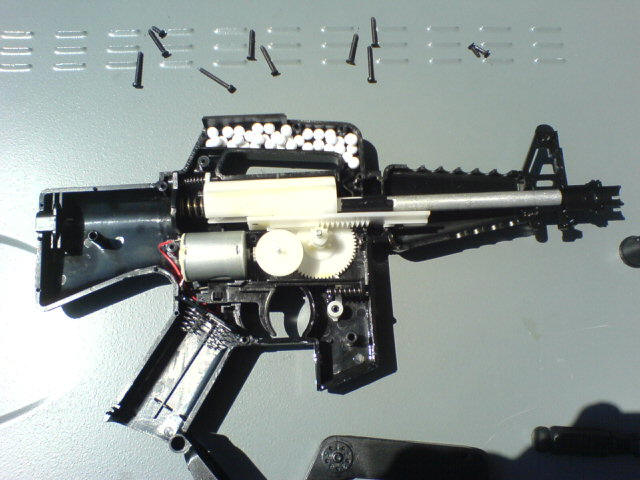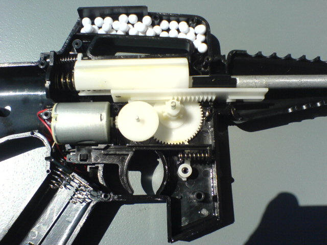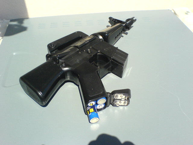 4 AA Batterien oder Akkus passen in den Griff. Damit wird dann einer ROF von ca. 2 Schuß pro Sekunde erzeugt.