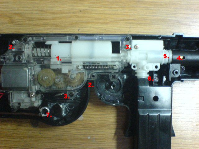 Verwenden wollte ich von Anfang an eine billige Gearbox aus einer einfachen AEG, die man entweder billig ersteigern kann oder aus einer alten defekten überflüssigen Softair ausbauen kann. Dann war es tatsächlich so einfach, wie ich es mir vorgestellt habe. Dort wo normalerweise der Mechanismus für den Federdruckzylinder eingebaut ist, habe ich Platz für die Gearbox geschaffen. Dabei habe ich darauf geachtet, Leisten und Noppen nur soweit wegzuschneiden, wie die Gearbox (1.) tatsächlich Platz benötigte. Das hat mir das anfertigen einer extra Befestigung für die Gearbox erspart. Seitlich wir die Gearbox von den Resten dieser Leisten und Noppen festgehalten, genauso wie Hinten und vorne Reste (2.) die Gearbox ausreichen stabilisieren. Trotzdem habe ich noch zwei (3.)Stifte eingeplant, die ein verrutschen der Gearbox absolut sicher ausschließen sollen..