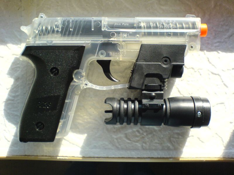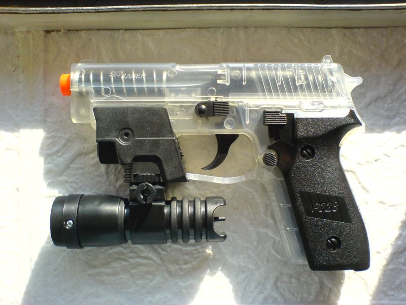 Das Target Device hat ein funktionierendes weisses Licht und eine rote Lampe als Laserimitat, die jeweils einzeln zuschaltbar sind. Die Lampen kann man somit nicht gleichzeitig einschalten. Das Target Device ist ausschließlich kompatibel mit der Wicke Amorcespistole Walther P99, was der Grund ist, warum sie legal ist. Auf den folgenden Bildern habe ich das TD, zur Veranschaulichung an einer SIG226 Softair unter 0,5 Joule ausprobiert. Das TD ist nur aufgeschoben und klemmt gerade mal genügend fest um diese Fotos zu machen. Aber für die Basteler unter uns eröffnen sich so natürlich viele Möglichkeiten das Target Device als Attrappe gut verwenden zu können. Die einfachste Möglichkeit ist ein doppelseitiges (Teppich)Klebeband.