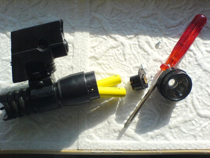 In einer herkömmlichen Attrappe müßte man in das Batteriefach nun Harz oder Klebstoff füllen, um es funktionsunfähig zu machen. Bei dem TD von Wicke dagegen erlaube ich mir zwei AAA Micro Batterien, die übrigens nicht enthalten sind, einzusetzen. Dafür muss man die Taschenlampe umständlich öffnen, indem man die beiden silbernen Schrauben löst. Dann muss man das Birnchen samt Halter herausziehen und kann dann die Batterien einsetzen. Zusammenbauen in umgekehrter Reihenfolge.