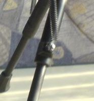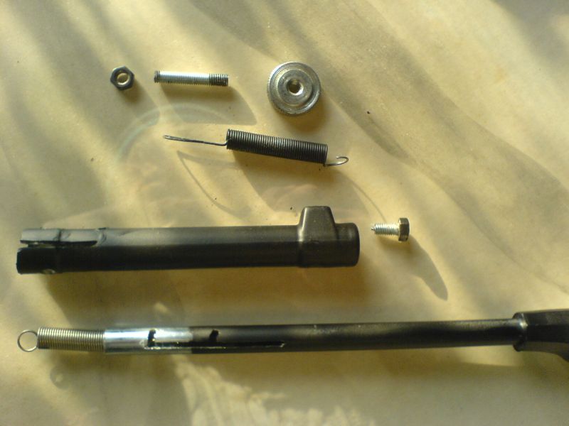Nachdem ich die richtige Länge der Schlitze gefunden hatte wollte ich nun "mein" in der Länge verstellbares Zweibein verwirklichen. Meine Idee hierbei war, das Innenrohr oben mit einer Feder zu befestigen. Dadurch würde das Bein immer nach oben gezogen und nicht herausfallen können. Wenn man das Bein verlängern wollte, mußte man es nur herausziehen und dann feststellen. Schraube oder Klammer war mir in der Handhabung zu umständlich. Um das bequem mit einer Hand machen zu können, habe ich mich für eine Rasterung entschieden, die ich durch Drehen des Beins einstellen kann.