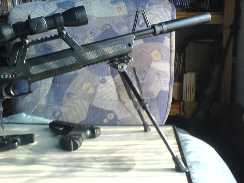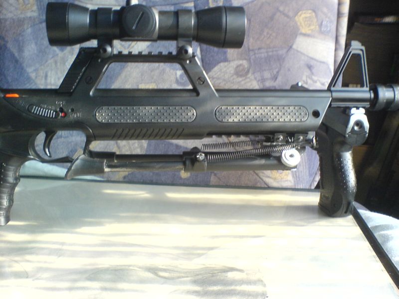 Hier kann man sehen wie das Zweibein an der Rail befestigt wurde. Zur Befestigung ist ist ehrlicherweise zu sagen. Plastik auf Plastik ist nicht besonders stabil. Wenn man das Gewehr mit Gewalt nach vorn oder nach hinten schiebt, droht das Zweibein von der Rail herunter zu springen. Beim tragen ist es dagegen ausreichend stark befestigt. Die Beine sind ausgeklappt und eingeklappt sehr stabil.